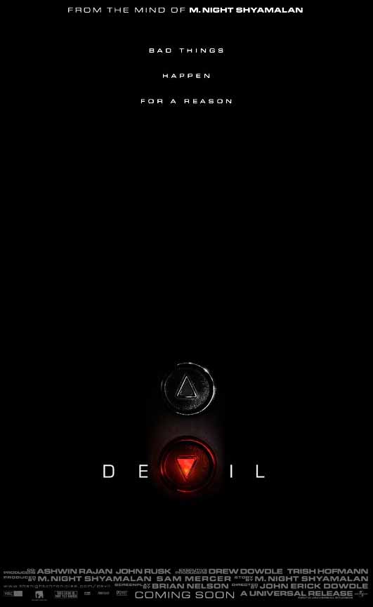 'DEVIL' is a 2010 horror film in which 5 people trapped in a lift realise that the devil is among them. The actors used in this film are not as well known as 'A' listed celebrities. It was directed by John Erick Dowdle who is a well-known director in the trade. Music and dialogue is used throughout the trailer to keep suspense and add to the audience's anticipation. There is no voice over, but instead inter-titles explain the movie with clever cuts from the movie its self.